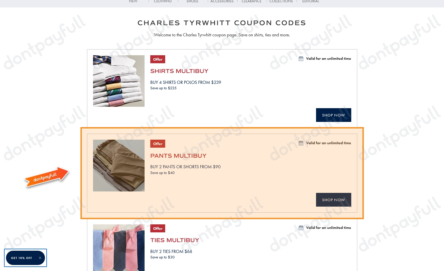 Coupons | Charles Tyrwhitt Charles Tyrwhitt coupon codes Welcome to the Charles Tyrwhitt coupon page. Save on shirts, ties and more. Offer Shirts multibuy BUY 4 SHIRTS OR POLOS FROM $239 Save up to $235 Valid for an unlimited time Shop now Offer Pants multibuy BUY 2 PANTS OR SHORTS FROM $90 Save up to $40 Valid for an unlimited time Shop now Offer Ties multibuy